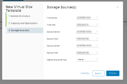Added Backup Server (Child) and Backup Pool fields in the New Virtual Disk Template > Storage Sources section. These fields enable support for 3-way mirrored Virtual Disks, which require a Backup Server (Child) for redundancy and, optionally, a dedicated third pool. These fields are visible only when using DataCore SANsymphony PSP20 or later.